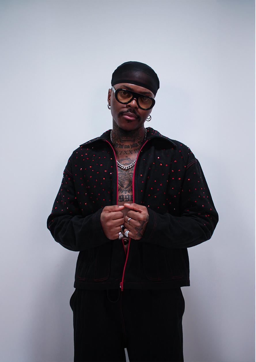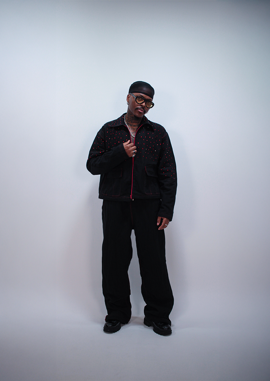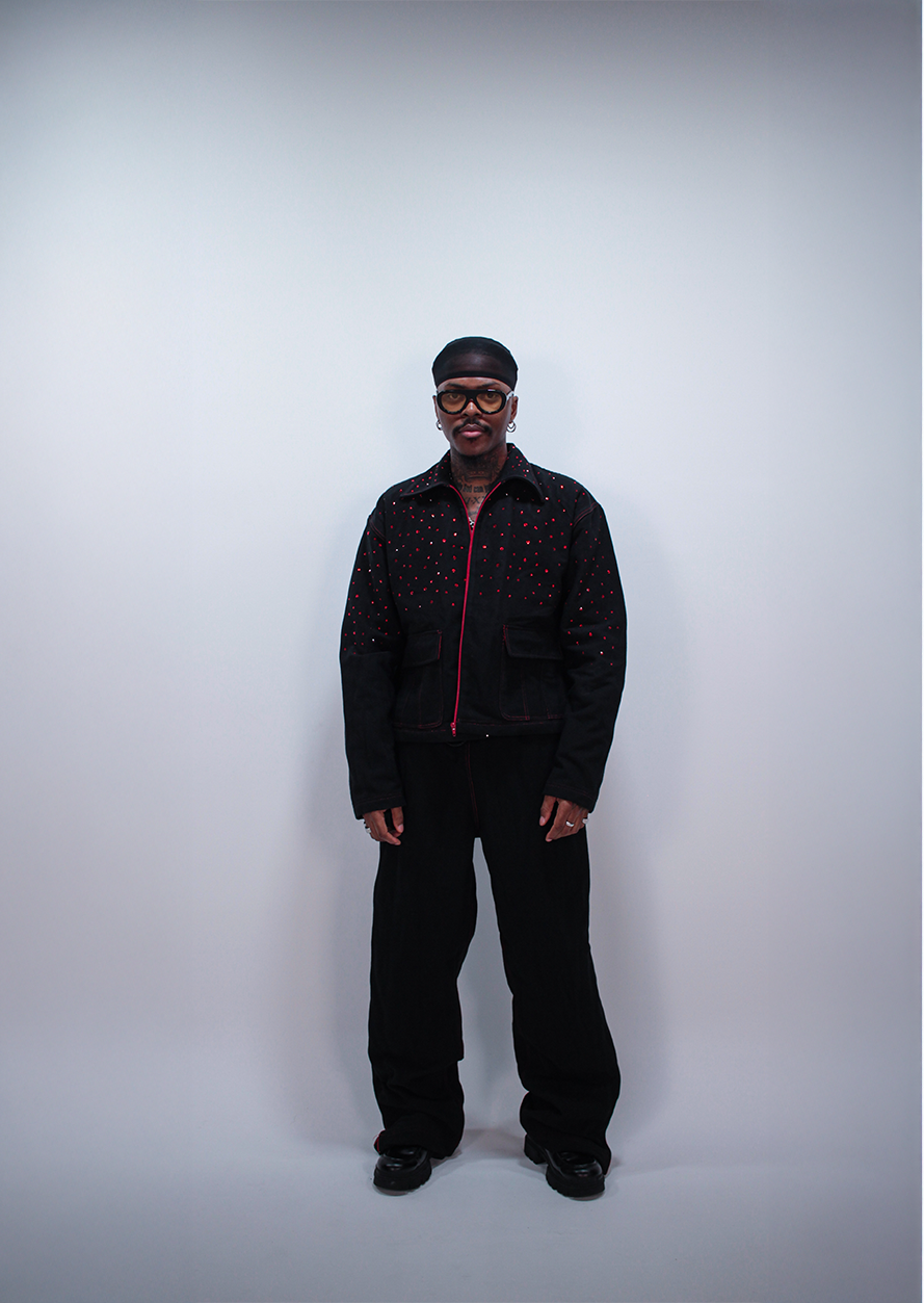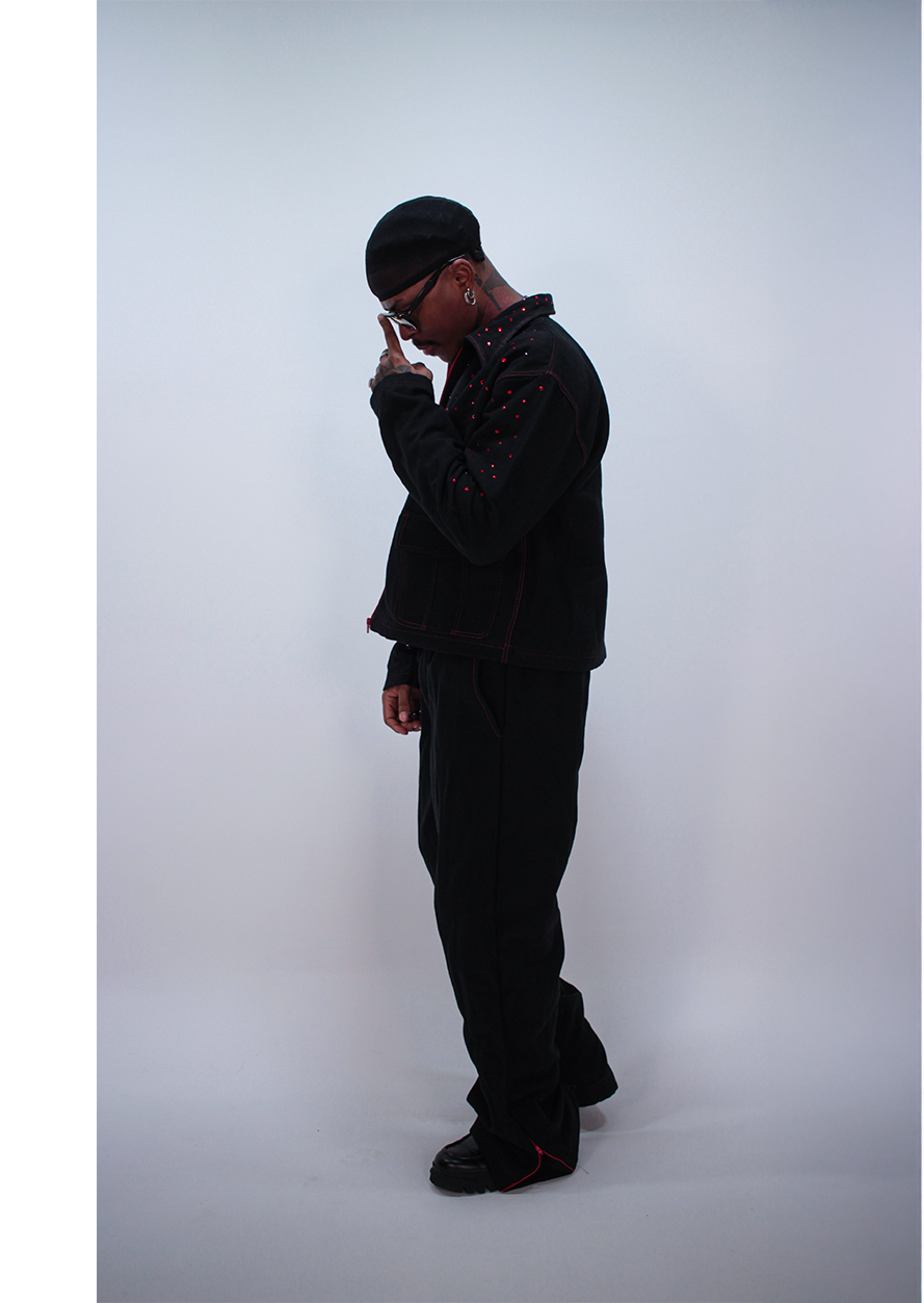 Confectionné en jean, made in France, il associe structure brute et éclat maîtrisé. Sa coupe affirmée impose la silhouette, tandis que les strass brillants captent chaque mouvement, chaque regard.